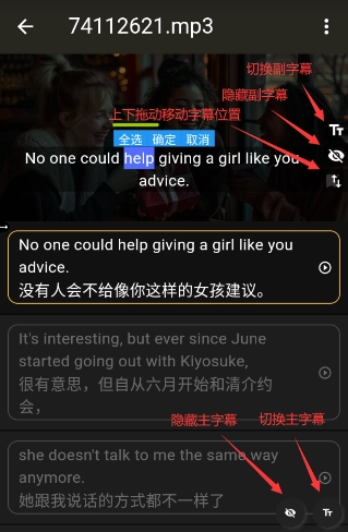 字幕有主副之分,词汇标注等功能都依托于主字幕;副字幕默认处于隐藏状态,点击小眼睛图标即可开启。