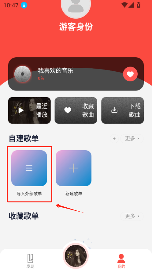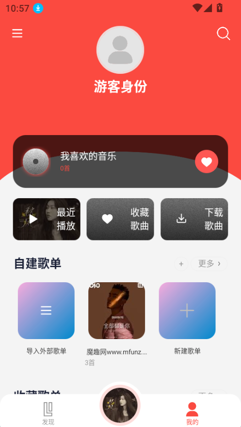 点击【我的】能够自行创建歌单,还可以管理收藏内容以及查看最新播放的歌曲。