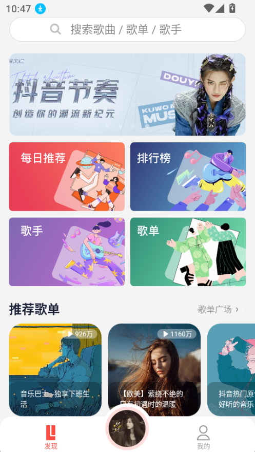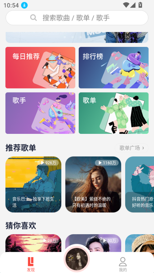 发现频道提供每日推荐、排行榜、歌手、歌单以及推荐歌曲等内容的查看功能。