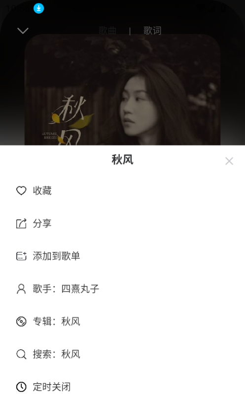 直接点击歌曲就能进入播放界面,在该界面可进行收藏、添加到歌单、定时关闭、分享等操作。