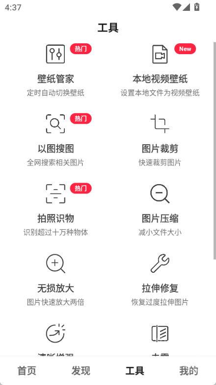 图片工具配备了自动切换壁纸、AI识图、以图搜图、无损放大等实用功能,全部免费开放体验,能让你挑选壁纸的过程变得更智能、更便捷。