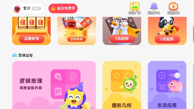 益智闯关:设置了140多个益智关卡,包含逻辑推理、图形几何等主题,没有次数限制,孩子可以通过闯关练习提升综合能力。