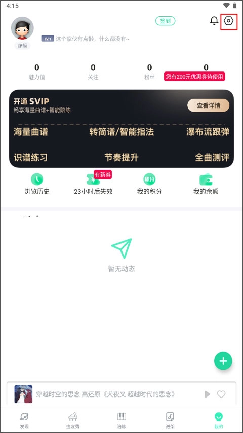 找到界面右下角的【我的】选项并点击,接着点击页面右上方的齿轮形状图标,即可进入设置页面。