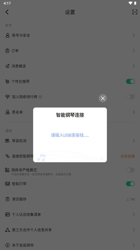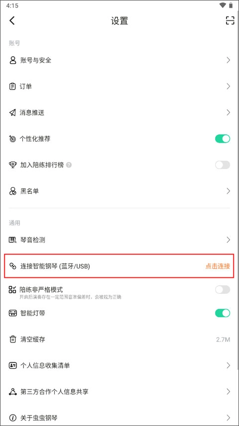 在设置界面中找到【通用】选项,进入后选择【连接智能钢琴】。