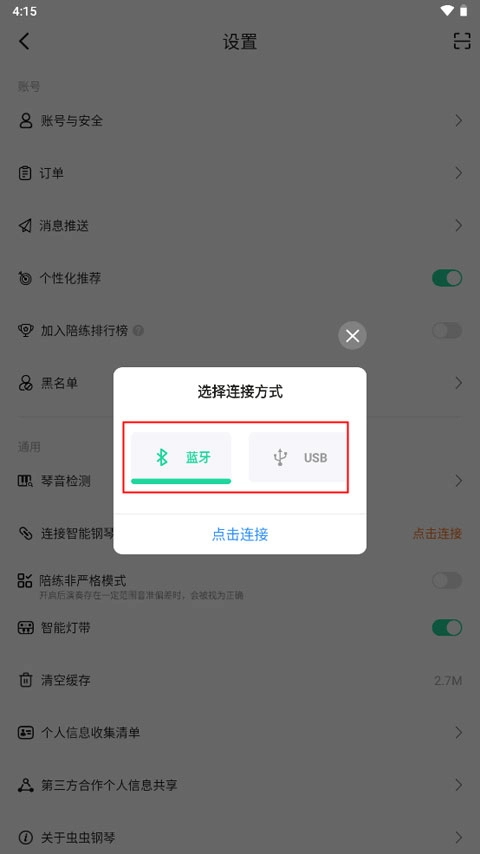 请先选择蓝牙或USB作为连接方式,再点击【连接】按钮。