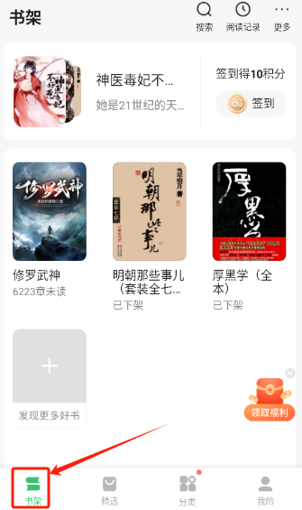 安装并打开百度小说(百度阅读)后,底部最左边的图标就是书架。
