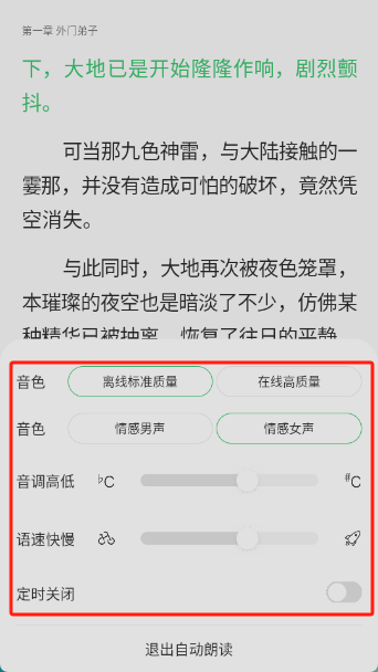 点击之后就能直接进入朗读模式,这个模式其实就是听书模式。在朗读模式下,你还可以调整音色、语速快慢以及音调高低等设置。