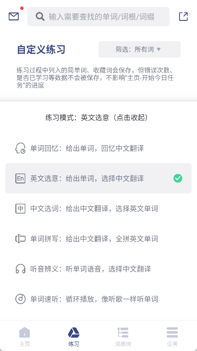 进入任意一个练习模式,例如“英文选意”模式。
