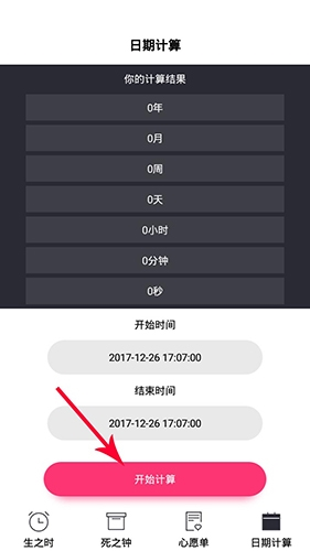 输入我们的出生日期以及预计的结束日期,接着点击“开始计算”按钮。