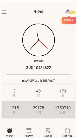 - 生之时:记录出生天数、年龄和时光。