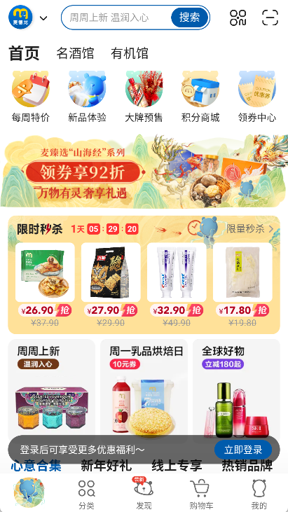 在首页可以看到每周特价、新品试吃和积分商城等功能板块。