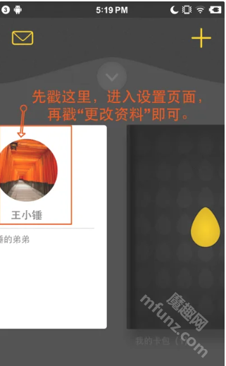 打开平行世界进入首页后,点击首页下方的“我的卡包”按钮,再点击头像进入个人设置页面。
