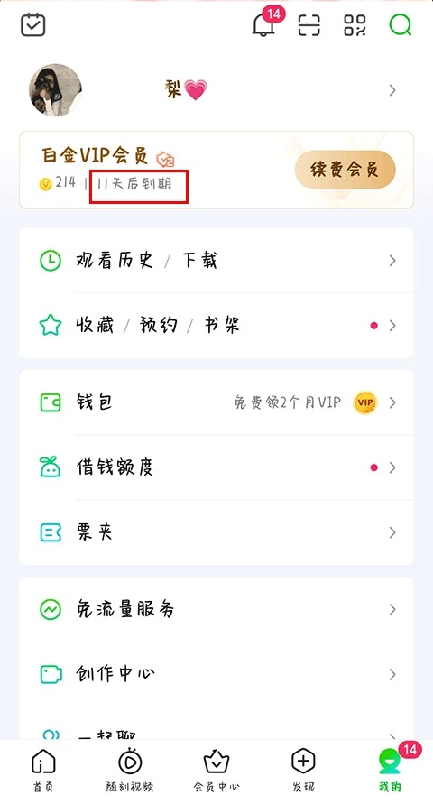 在“我的”页面,点击上方会员栏上的“到期时间”;