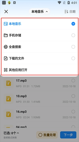 这里可以选择本地音乐、手机储存、全盘搜索的文件等。