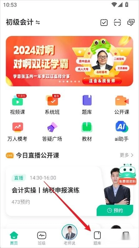 打开对啊课堂App,点击底部导航栏中的题库。