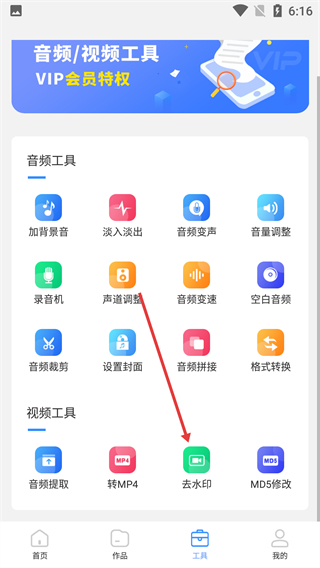 在工具页的【视频工具】分类下,选择【去水印】选项,即可进入短视频去水印操作页面。