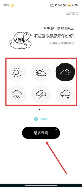 2. 在天气选择界面,选取当天的天气,比如【多云】,接着点击【是多云啊】,这样就完成天气记录咯。