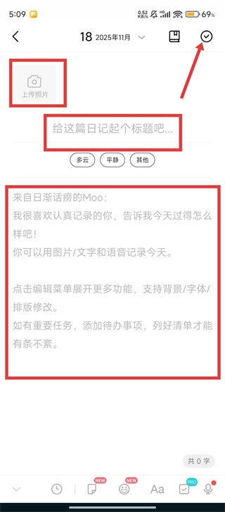 4、进入日记编辑页面,你能够【上传照片】,撰写标题,并记录相关内容。全部完成后,点击右上角的对勾,就能成功保存日记。