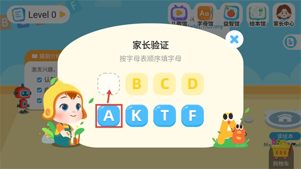 当【家长验证】弹窗出现后,按照字母表的顺序在对应位置选择填入【A】,完成这一步验证操作就能进入家长中心页面了。
