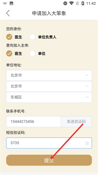 在申请加入的页面中,把身份选项选定为【医生】,接着填写【单位地址】、【联系手机号】以及【短信验证码】这些信息。