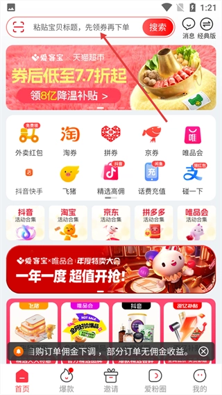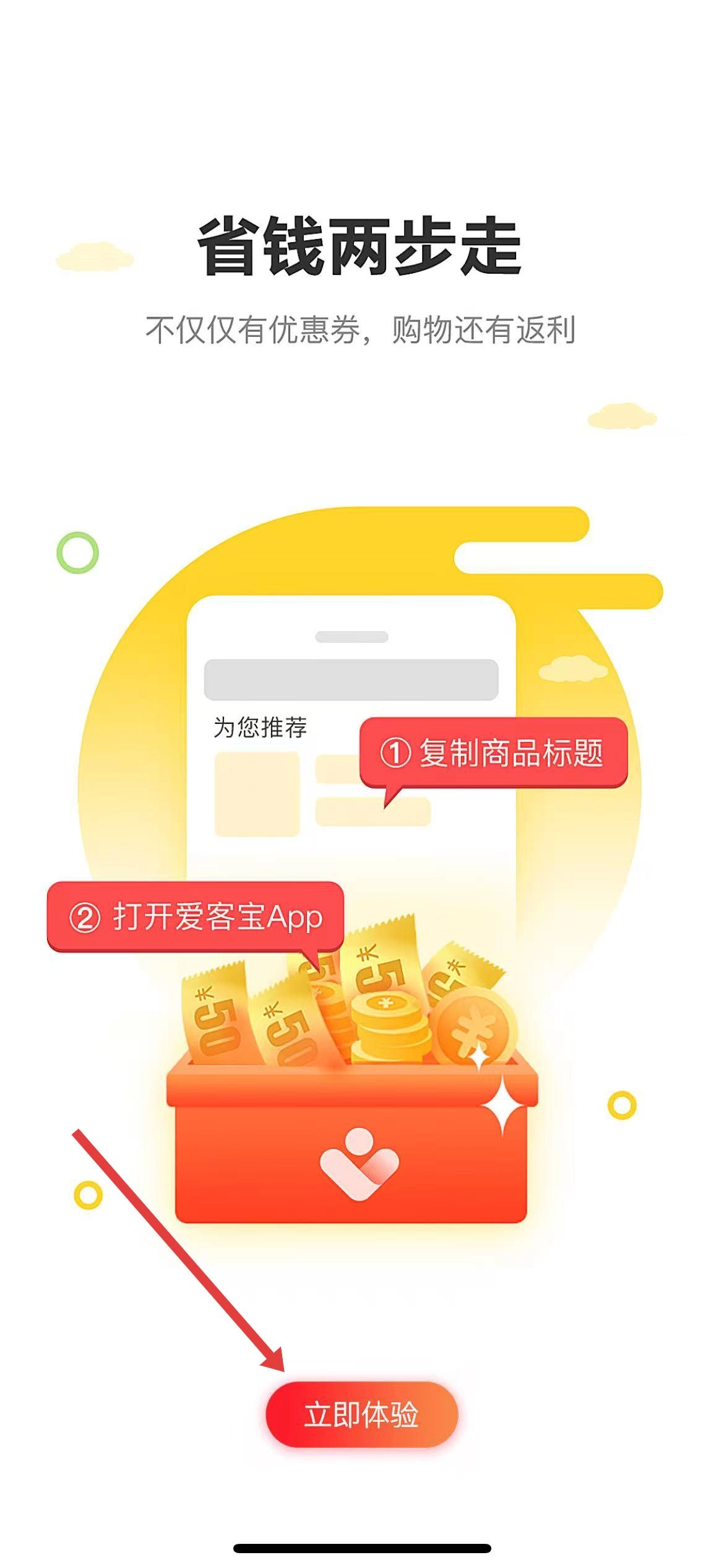 打开【爱客宝】,点击【立即体验】即可开启省钱流程。
