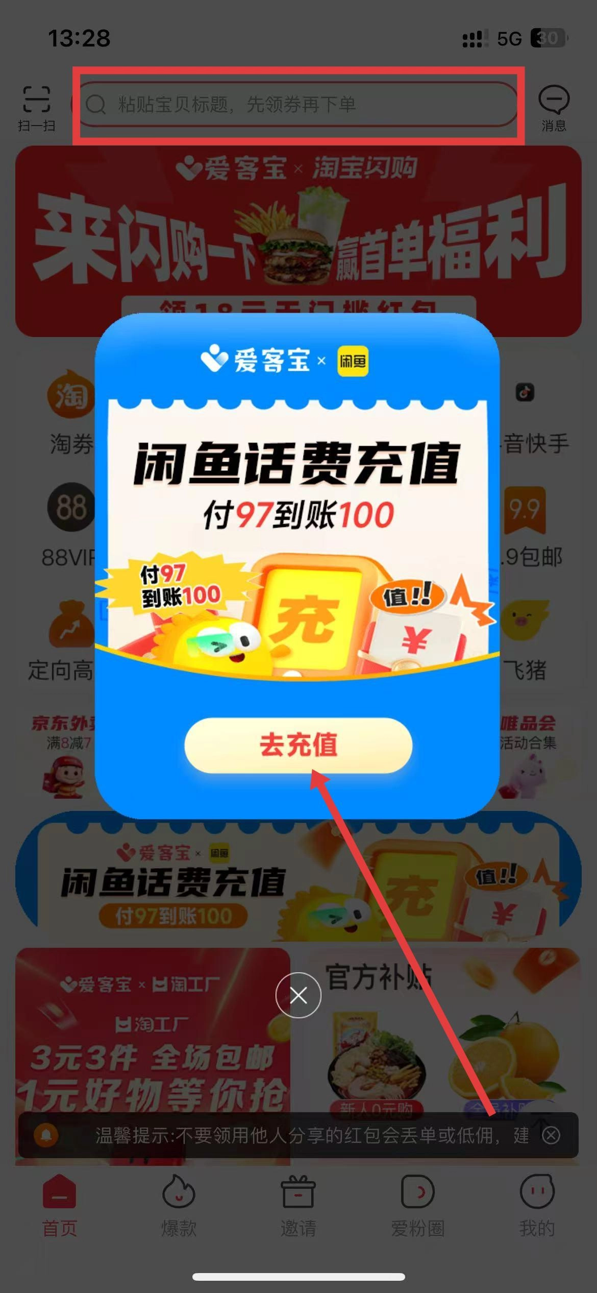 在爱客宝首页,您可以选择点击【去充值】按钮,或者使用搜索栏进行【搜索】操作。