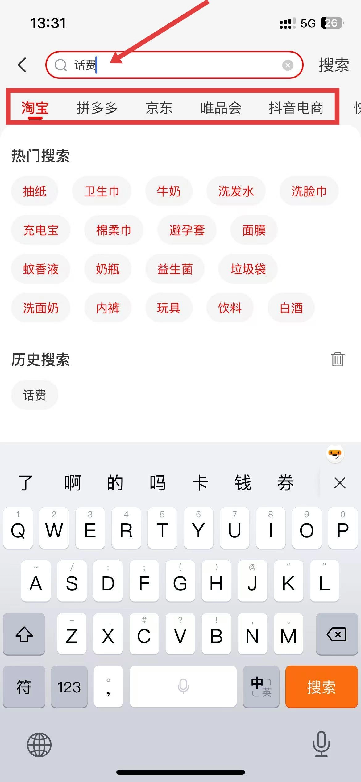 在搜索栏中输入关键词,例如【话费】,然后选择【淘宝】【拼多多】等平台,即可精准查找相关商品。