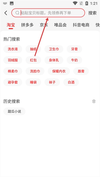 进入首页,点击顶部搜索栏,进入搜索页面。