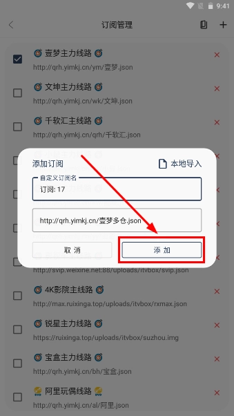 4、点击“+”号,会弹出添加订阅的弹窗,此时直接点击添加,完成后就能选择线路,返回首页看电视啦。
