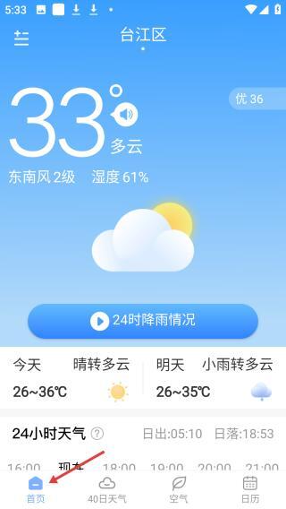 1、在本站完成安装后点击打开进入,即可查看台江区的实时天气情况,页面会显示当前气温33℃、天气状况为多云,同时呈现东南风等气象信息,还设有24小时降雨查询按钮。