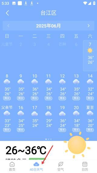 2、进入40日天气预报界面,即可查看台江区6月份的天气信息,其中包含每日的温度及天气状况,能帮助用户更早地规划出行安排。