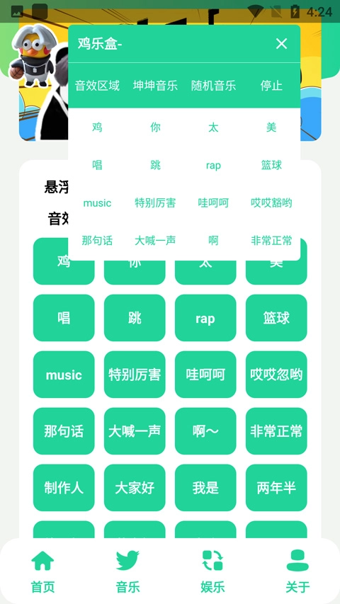 各类与坤坤相关的音乐、头像以及表情包,只需点击即可使用。