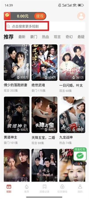 2、输入短剧名称后,点击右侧的搜索按钮,即可进行短剧搜索。