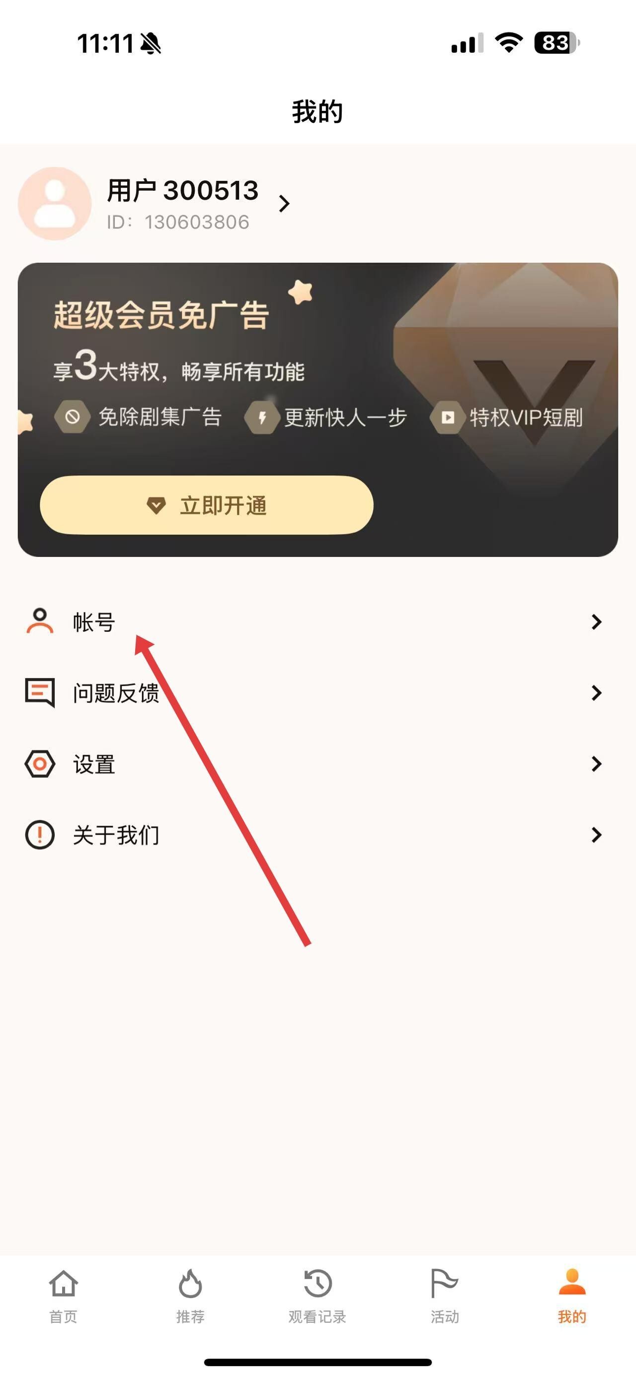 2、进入个人页面后,点击“帐号”选项,即可进入帐号设置界面。