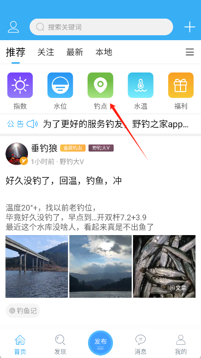 1、打开野钓之家,进入首页后点击“发布”按钮。