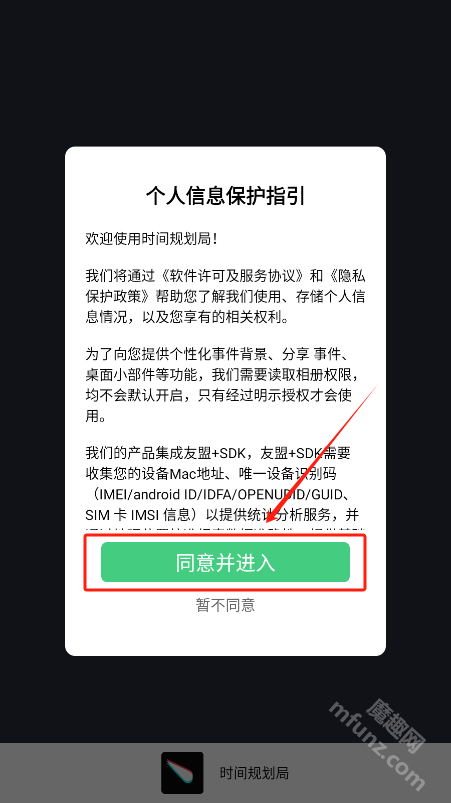 1、首先在魔趣网找到并安装时间规划局应用,接着点击“同意并进入”按钮进入软件。