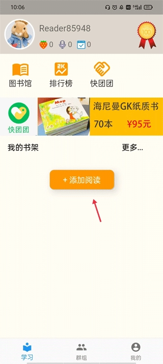 1. 在屏幕上选择“学习”,切换至该界面后,点击中间位置的“添加阅读”。