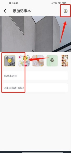 4. 进入添加记事本页面,依次选择文件标识,输入记事本的名称及描述,随后点击【文件图标】