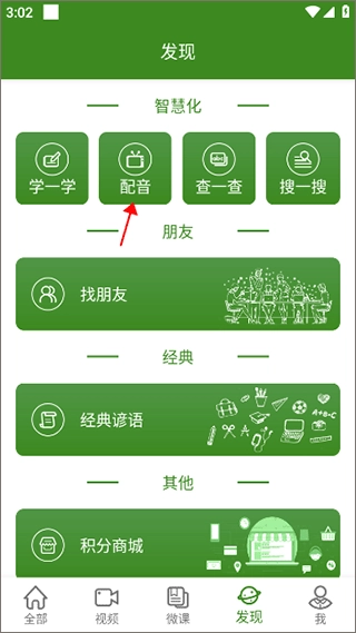 1. 开启bbe英语听力,进入到“发现”界面,点击“配音”选项。