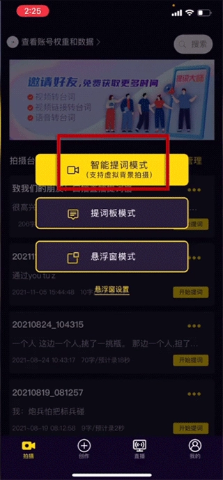 2、进入【拍摄】页面后,找到一条台词,接着点击“开始提词”,并选择首个智能提词模式。