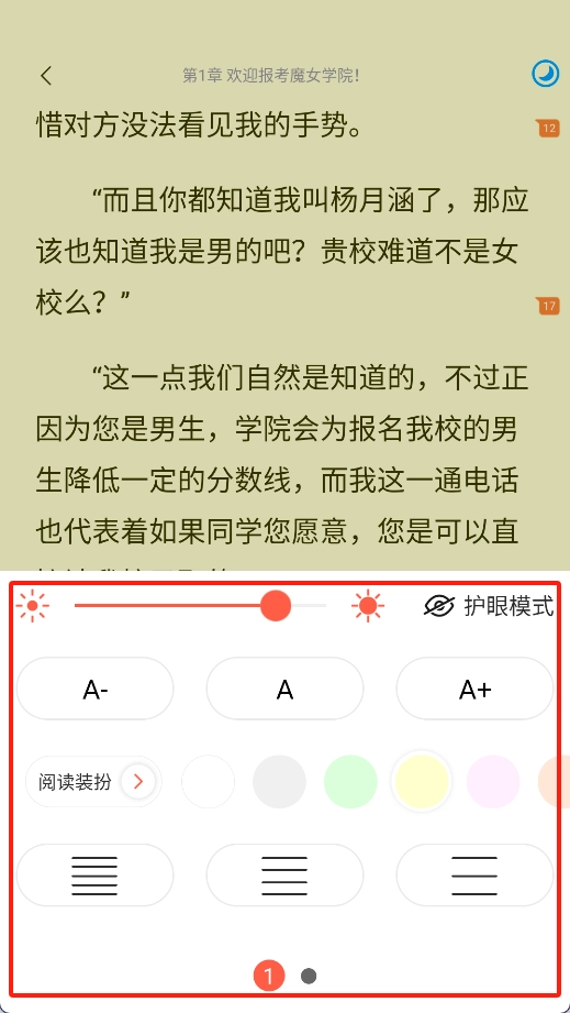 4、阅读设置:在阅读界面点击屏幕中间,就能对阅读相关设置进行调整,像字体大小、背景颜色、朗读模式之类的都可以设置。