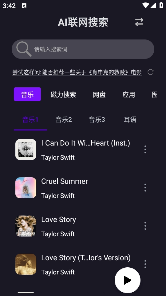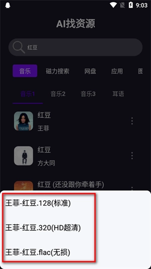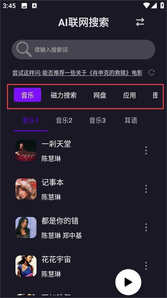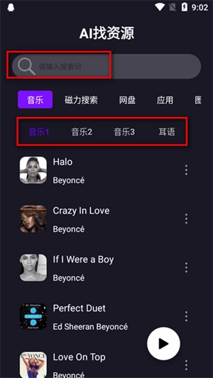 2. 打开软件并进入,你既可以选择搜索功能,也能直接点击音乐选项,这里有多个来源可供挑选。