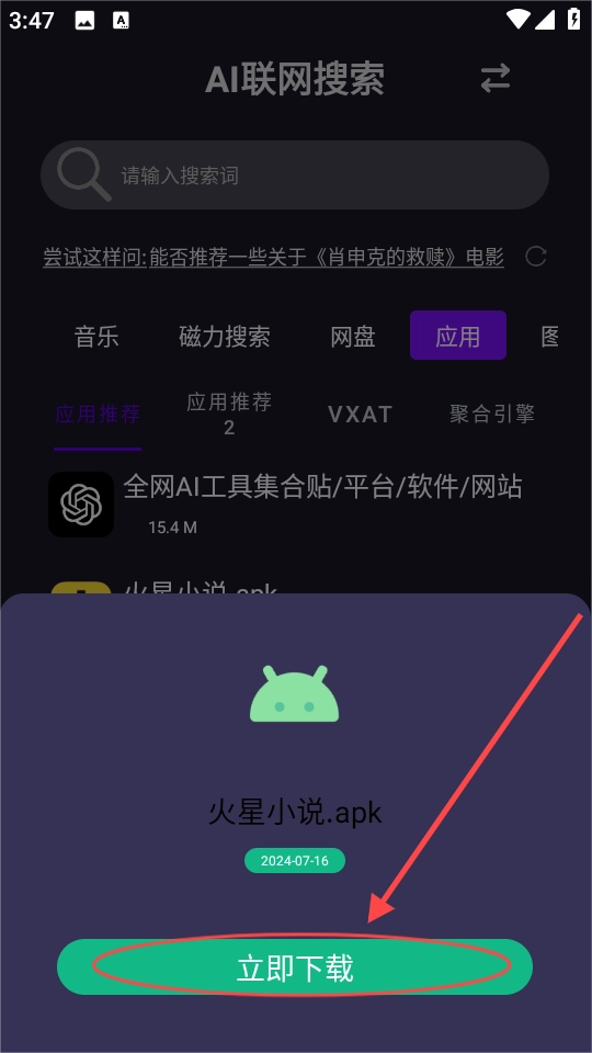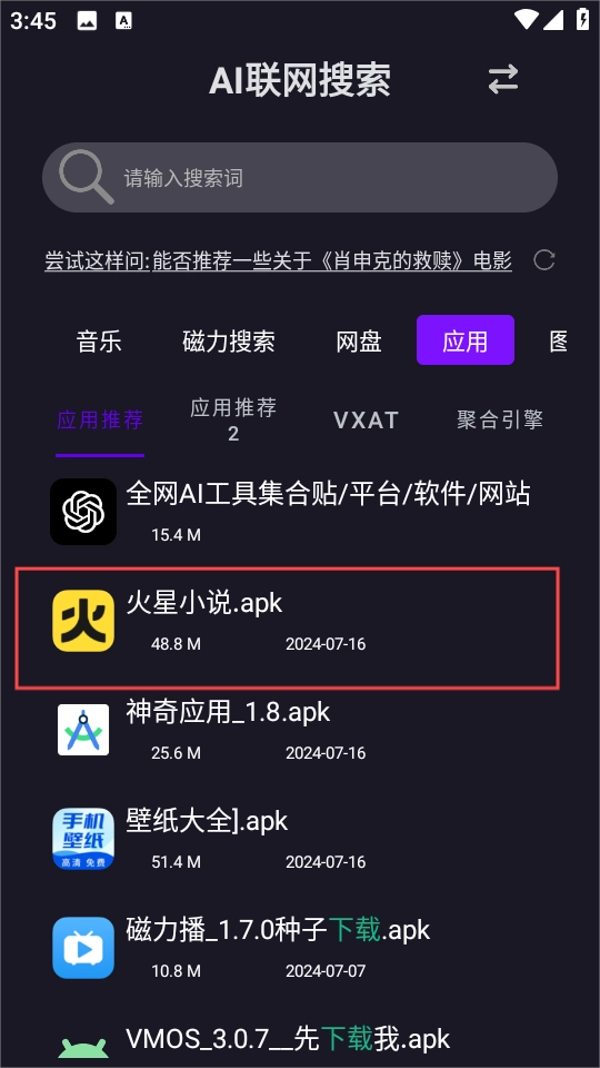 3、你可随意挑选一个所需资源来操作,在此,小编选取的是应用栏目中的“火星小说” 。