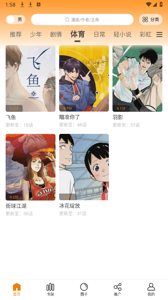 首页设有详细的漫画资源分类板块,涵盖体育、日常、轻小说等多种类别。