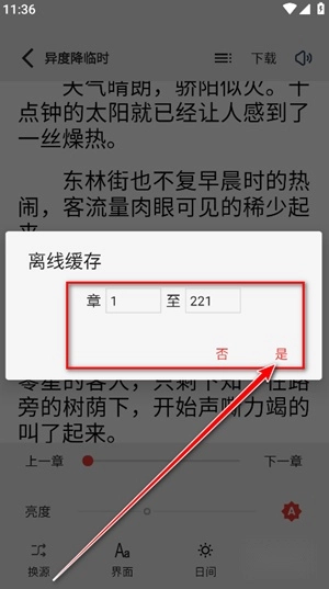 4、在弹出的窗口里,输入你所需离线缓存的起始章节与结束章节,确认无误后点击「确定」,即可完成操作。