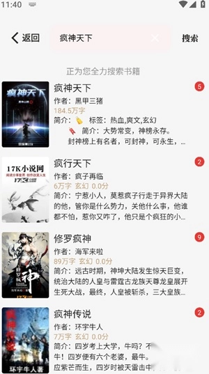 2、在搜索结果页面浏览并选定目标小说作品。