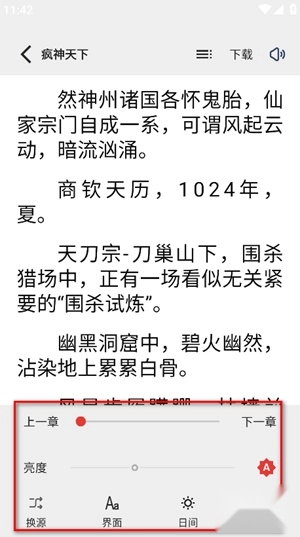 6、底部工具栏整合了章节切换、亮度调节、书源更换等实用功能。
