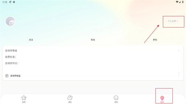 2、在应用内点击底部导航栏的【我的】,进入个人页面后,接着点击右上角的【个人主页】,即可进入账号相关界面。