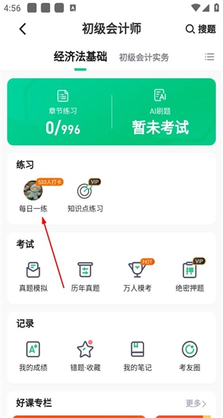 2、进入初级会计师页面,该页面包含章节练习等功能模块,从中选择每日一练选项,即可进入对应的打卡练习页面。