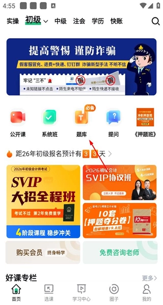 打开软件后,会呈现公开课等功能以及课程推广内容,接着选择“题库”选项,即可进入初级会计师的学习页面。